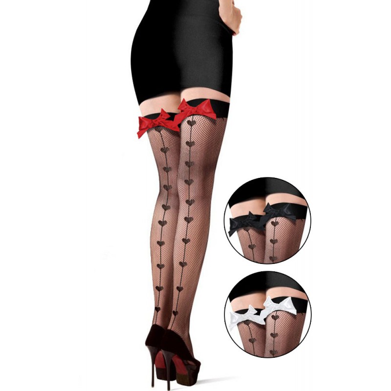 - Bas résille sublime noir avec noeud satiné rouge, blanc ou noir au niveau de la jarretière, un motif en ligne de coeur est réalisé sur l'arrière pour rendre vos jambes totalement craquantes.