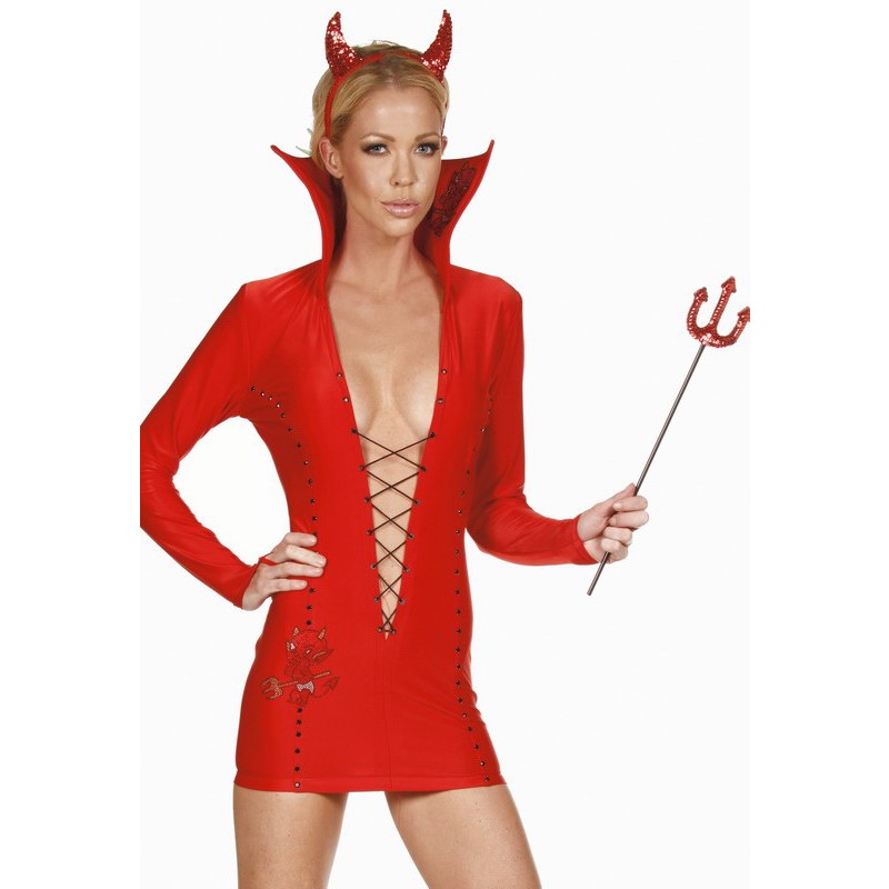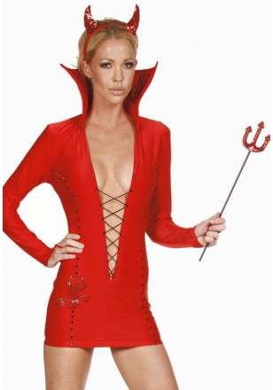 - Tenue de diablesse rouge incrustée de paillettes noir tout du long, la mini robe à une collerette incrusté d'un diablotin en strass ainsi que sur son bas, elle est accompagné d'une ouverture en V sur le devant muni d'un laçage pour son côté sexy. Cette tenue est accompagnée de ses cornes et de son trident scintillant.