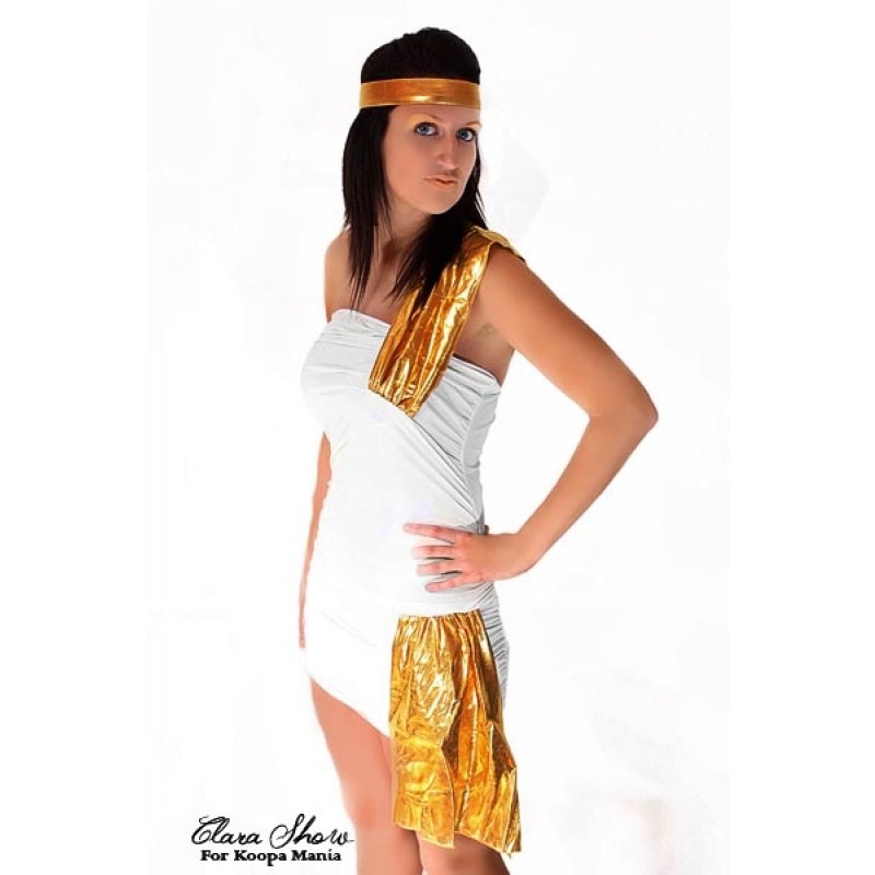 - Ce déguisement de spartiate pour femme se compose en deux pièces d'une robe et d'une coiffe. La robe est de couleur blanche avec des voilures doré. La coiffe est un bandeau doré.