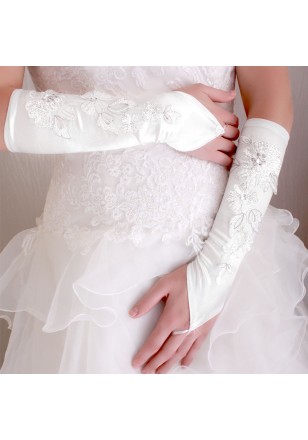 - Gants longs en satin brodé de sequins de couleur ivoire. Cette paire de gants est à motif floral, les fleurs sont en sequins et strass, quant au feuillage il est surpiqué d' un fil marron clair .