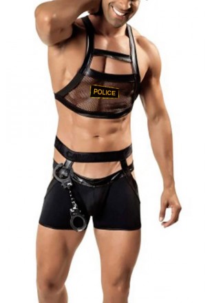 - T-shirt pour homme en fine résille ayant une inscription Police sur le devant avec des bandes aspect vinyl pour un effet cuir. Boxer noir assorti et menotte plastic inclus.