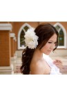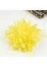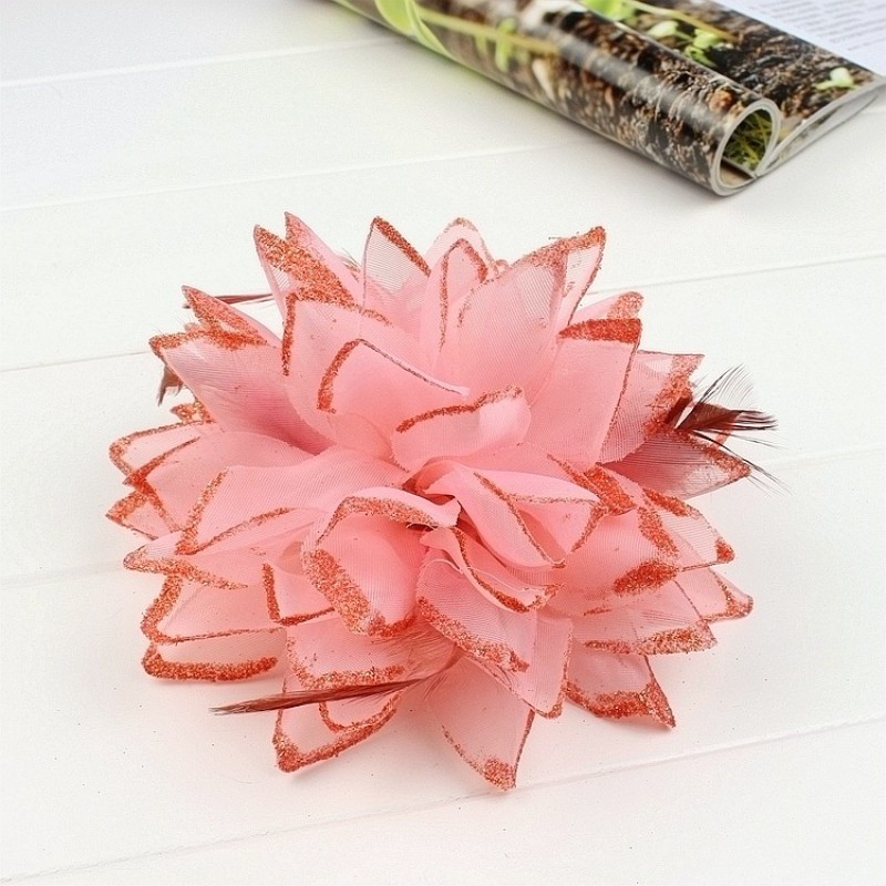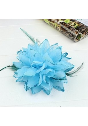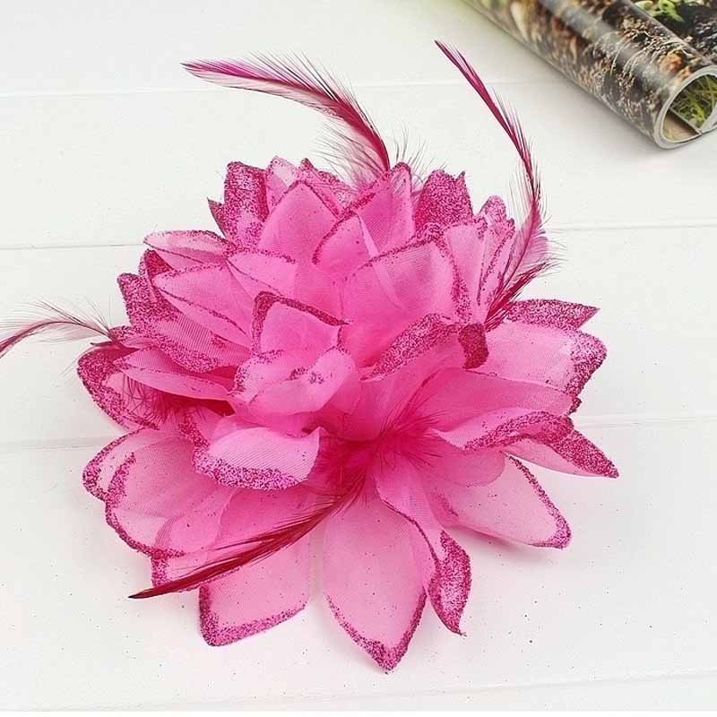 - Fleur en tissu rose, bleu roy, rouge, vert, jaune, blanc, rose corail, rose fushia ou bleu munie d'une épingle à nourrice, d'une pince et d'un élastique, elle est bordurée de paillettes et accompagnées de plumes. Idéal pour vos cérémonies grâce à ses 3 fonctions broche, pince ou chouchou.