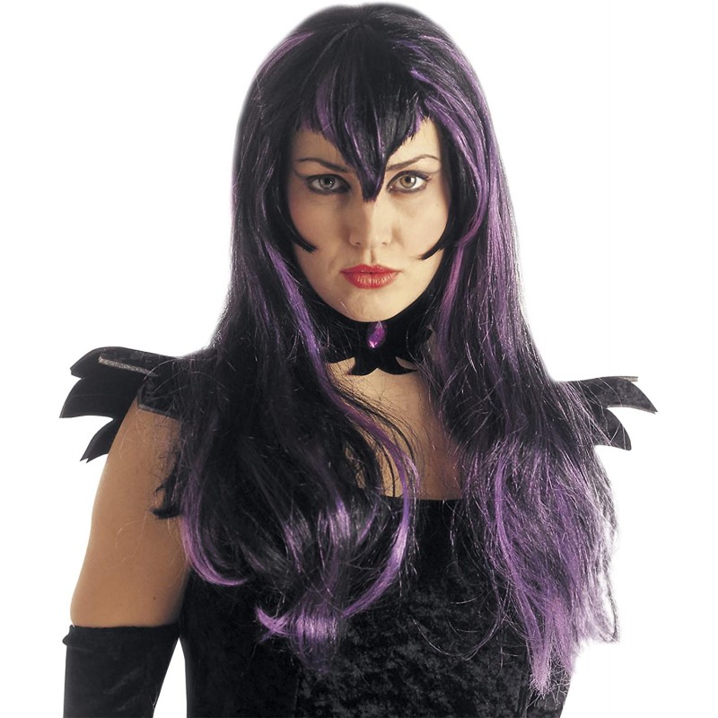 - Perruque de déguisement "Samantha", la maîtresse noire, de couleur noire avec mèches oranges ou violettes (à choisir). Pour adulte, taille unique.