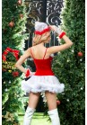 - Robe mère noël rouge et or borduré de plume avec le bas en tulle blanc ayant un imprimé argenté flocon de neige, mitaine, string et bonnet inclus.
